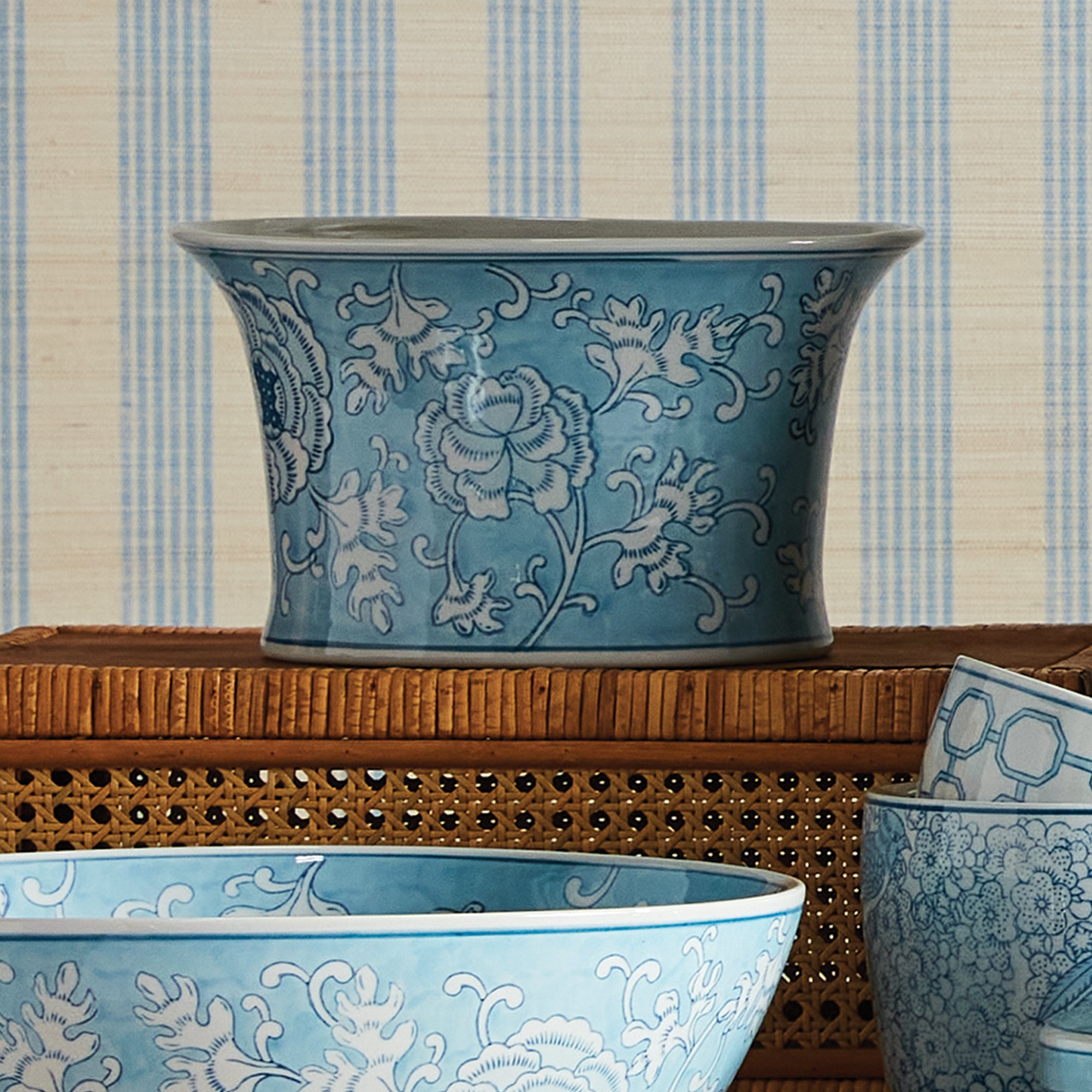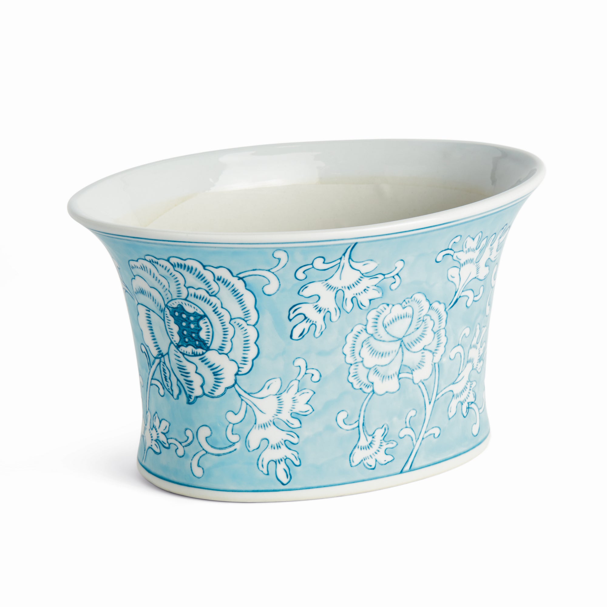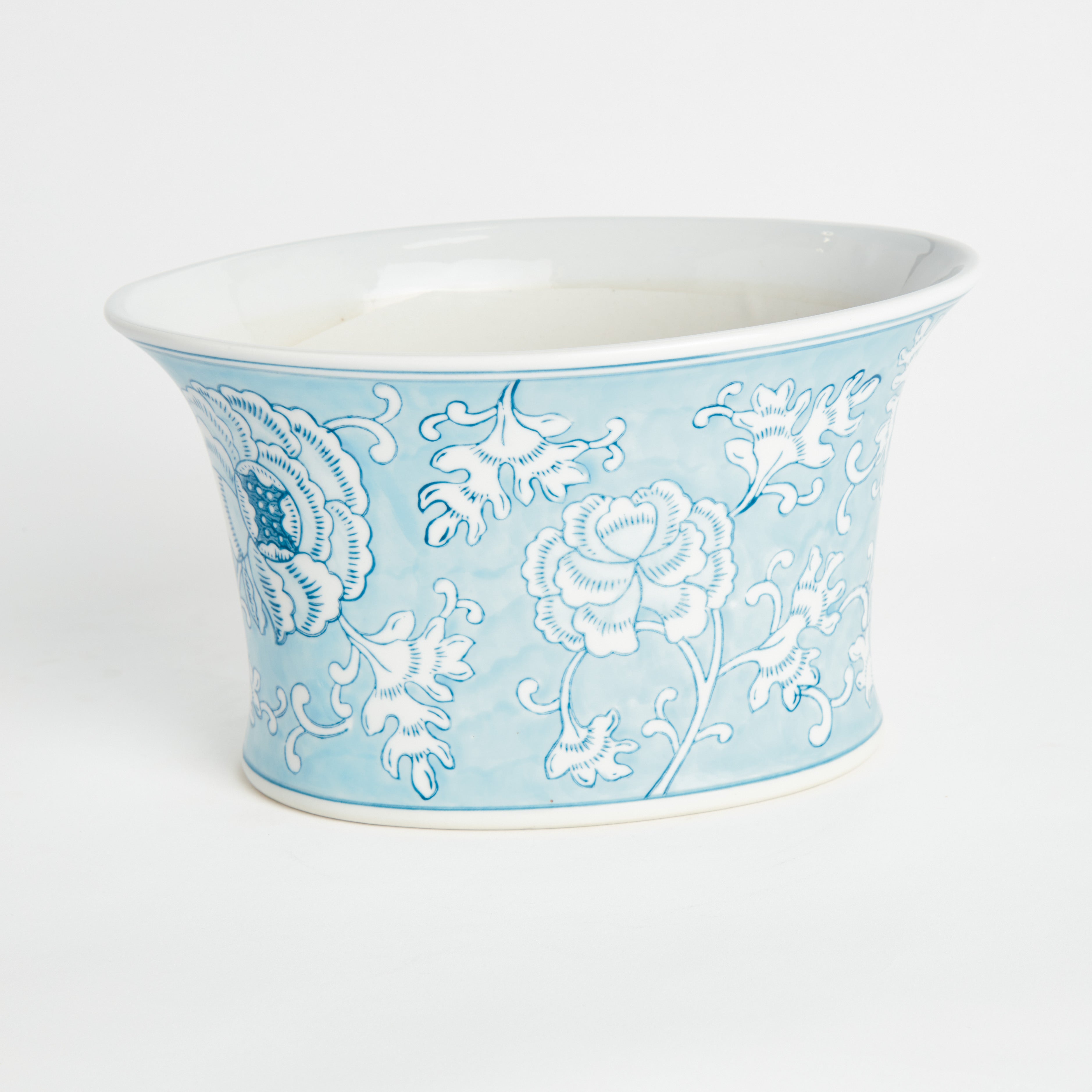 Our signature chinoiserie in an ethereal soft blue. A light, airy tone taking a cue from an on-trend, fashion forward color palette. This porcelain is painted by hand and hand-stamped, and the result is exquisite. Fill with your prized florals or add some lush greenery to complete the look.