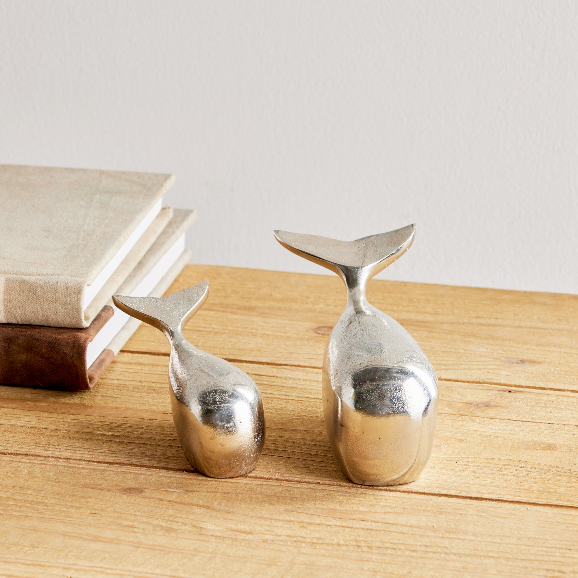 Quite a bit smaller than the real thing, these modern whale sculptures have just as much charm. Made of solid aluminum, this pair makes a great shelf accent for a coastal space, or anywhere to add a bit of character.
