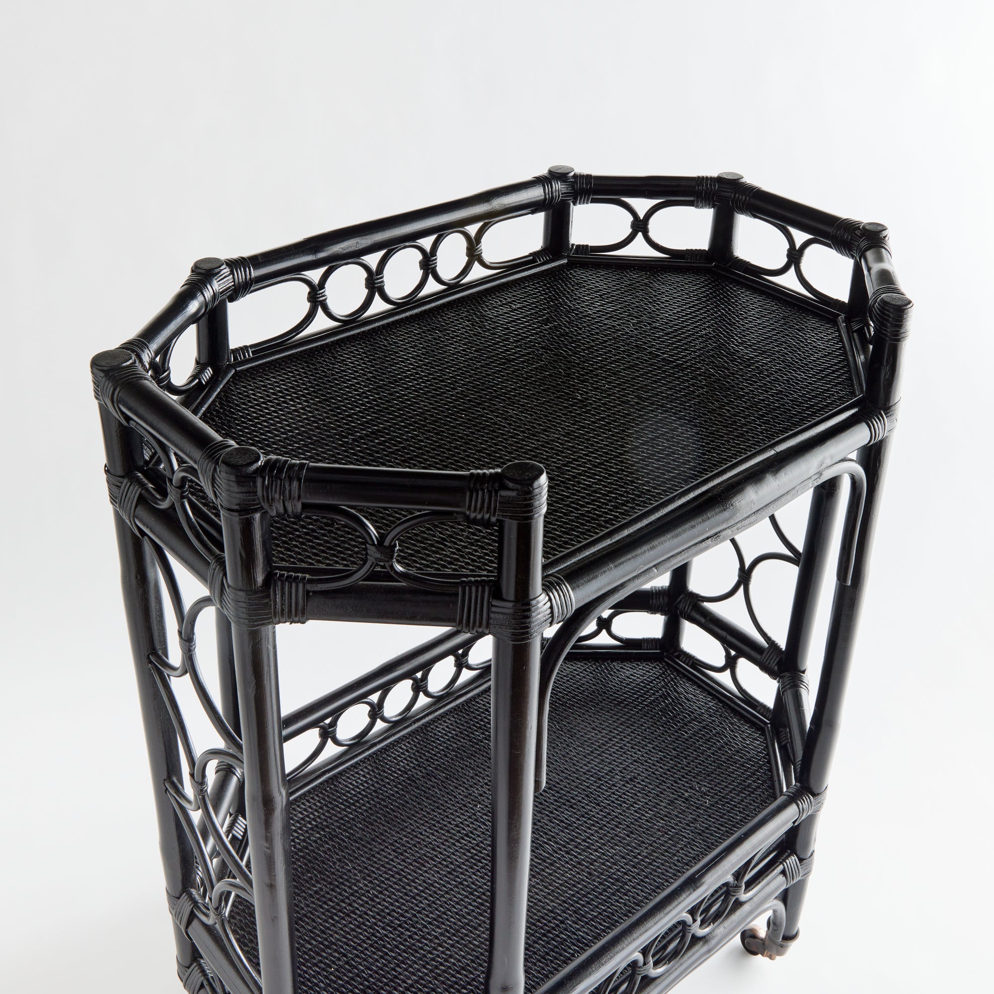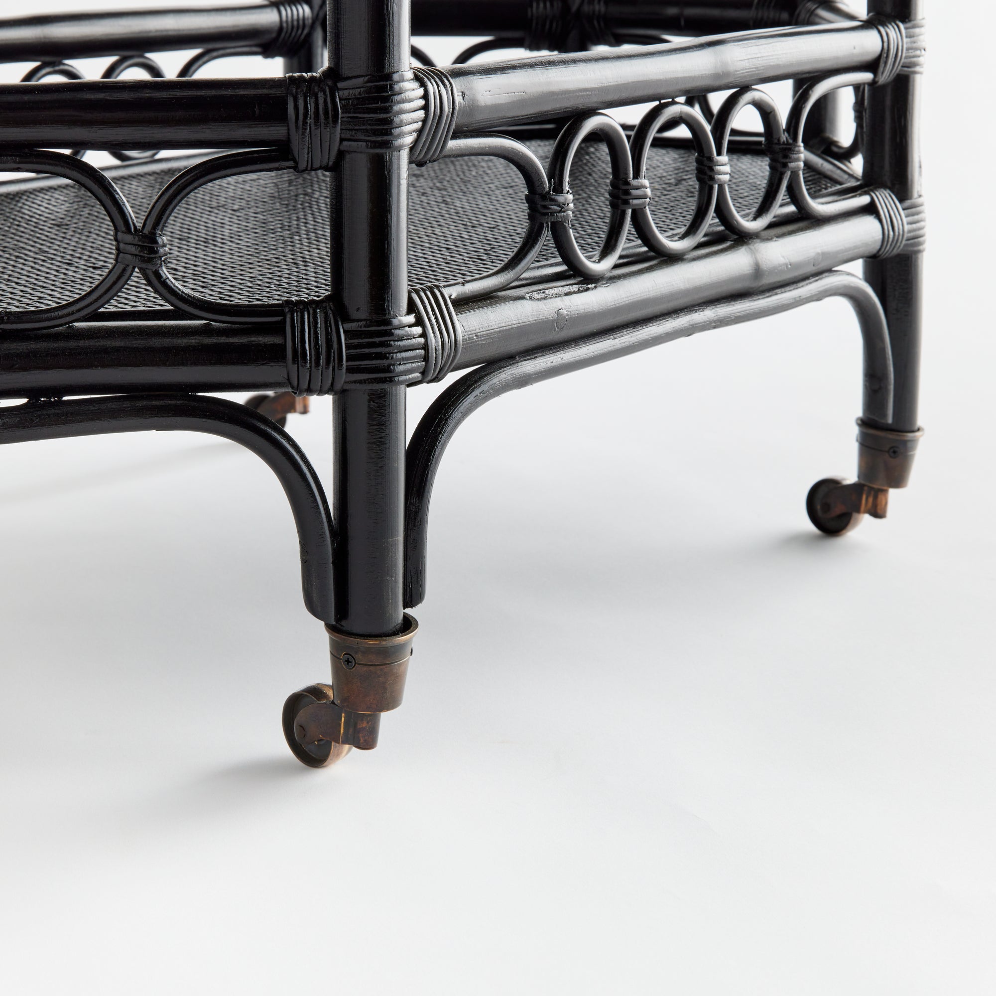 Handmade of cane and strip rattan, and fitted with brass casters, no detail was missed when designing this upscale bar cart. Curvy and refined, it is scaled to work well in the smaller space. Easily rollable, this bar cart is a simple way to bring the party right to your guests.