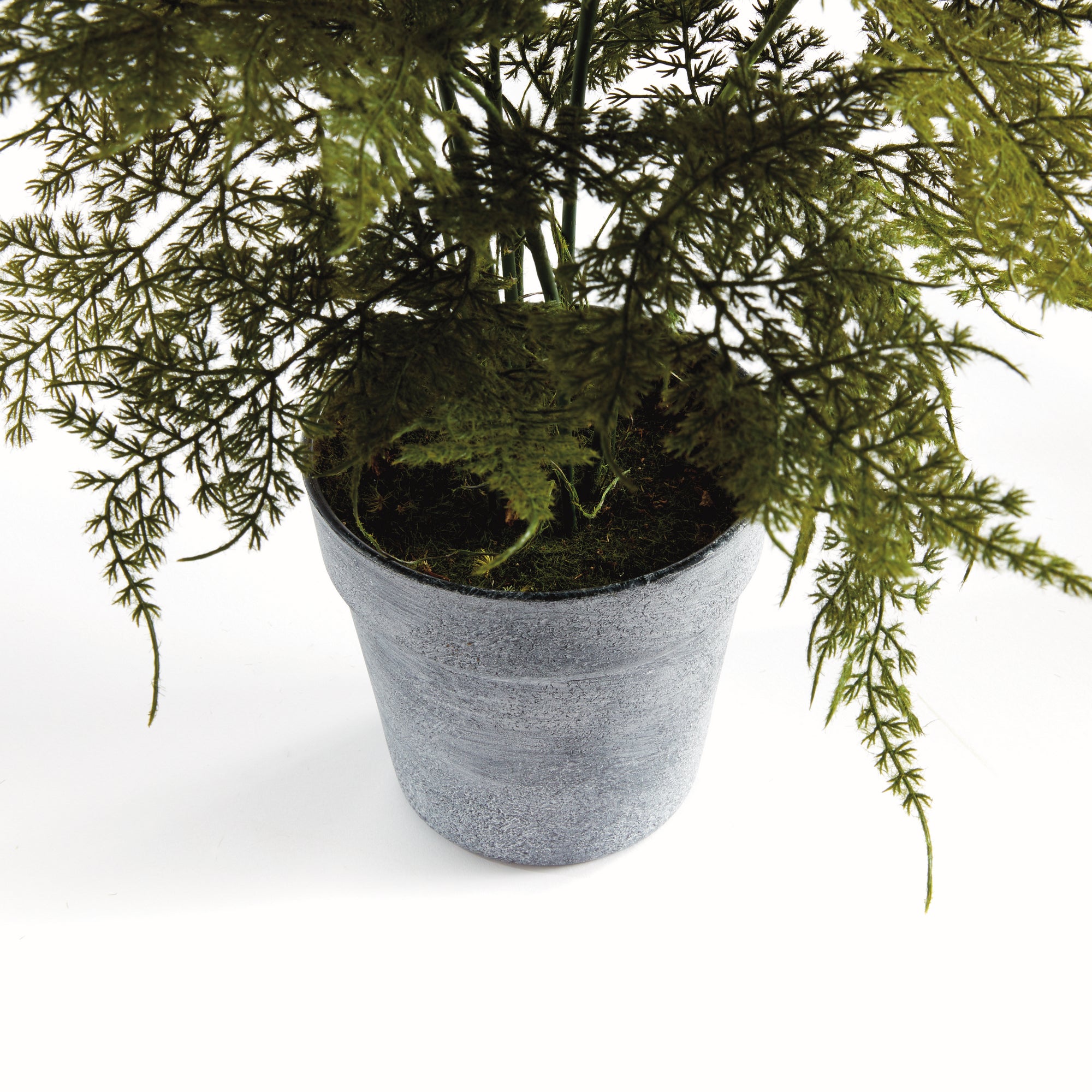 Experience the lush beauty of nature without the hassle. Our Plumosa Fern Drop-in is expertly crafted to mimic the intricate, feathery fronds of the real thing, and adds a touch of lush greenery. It comes in a standard sized cement pot to fit into a coordinating outer pot or planter, a versatile accent that brings the serenity of the outdoors in. Elevate your home decor with this low-maintenance fern, and enjoy the beauty of nature year-round.
