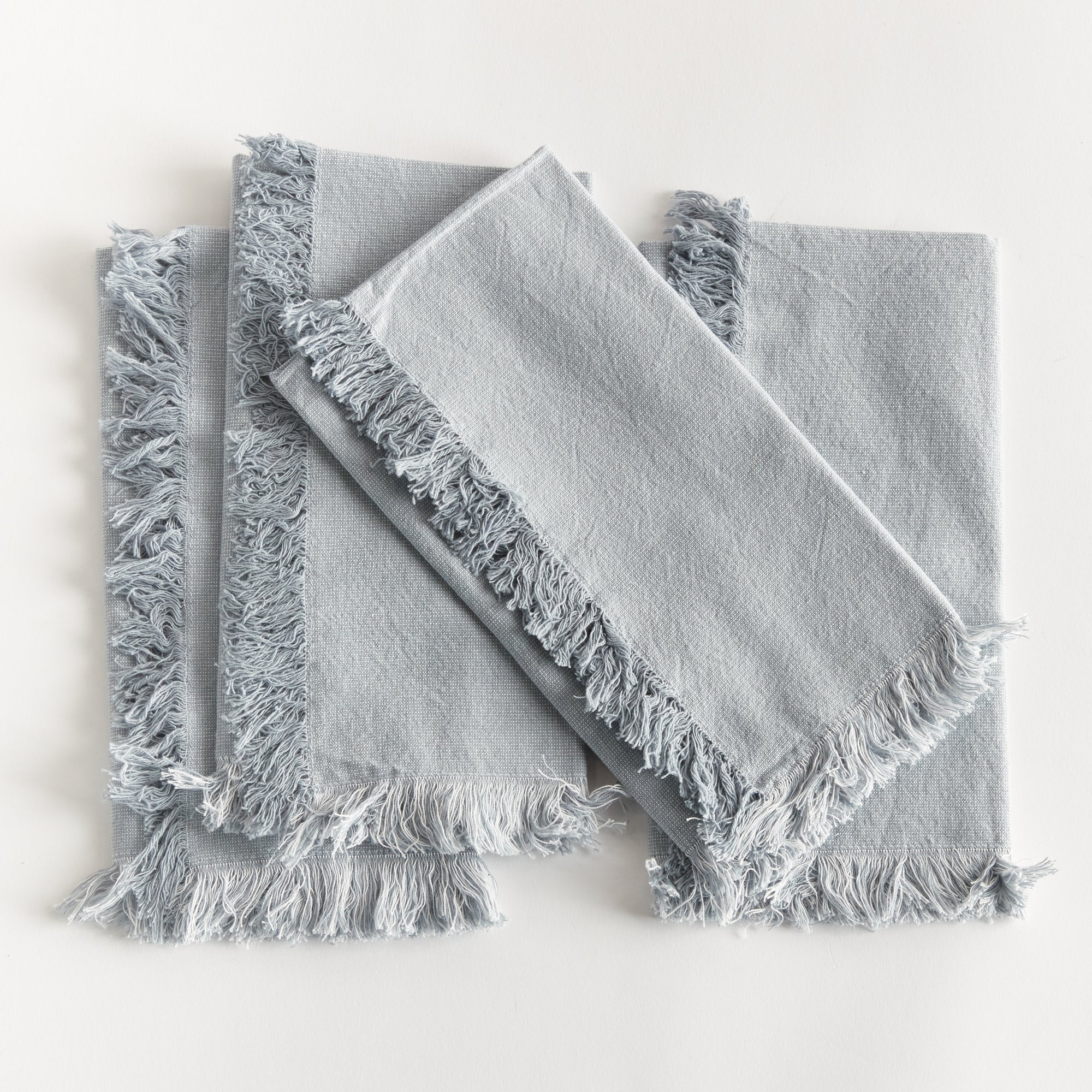 Bring a touch of softness to the table with this set of four cotton napkins. Beautiful in tone and texture, the light blue pre-washed fabric adds a rich pop of light color, and is made to coordinate with any tablescape.