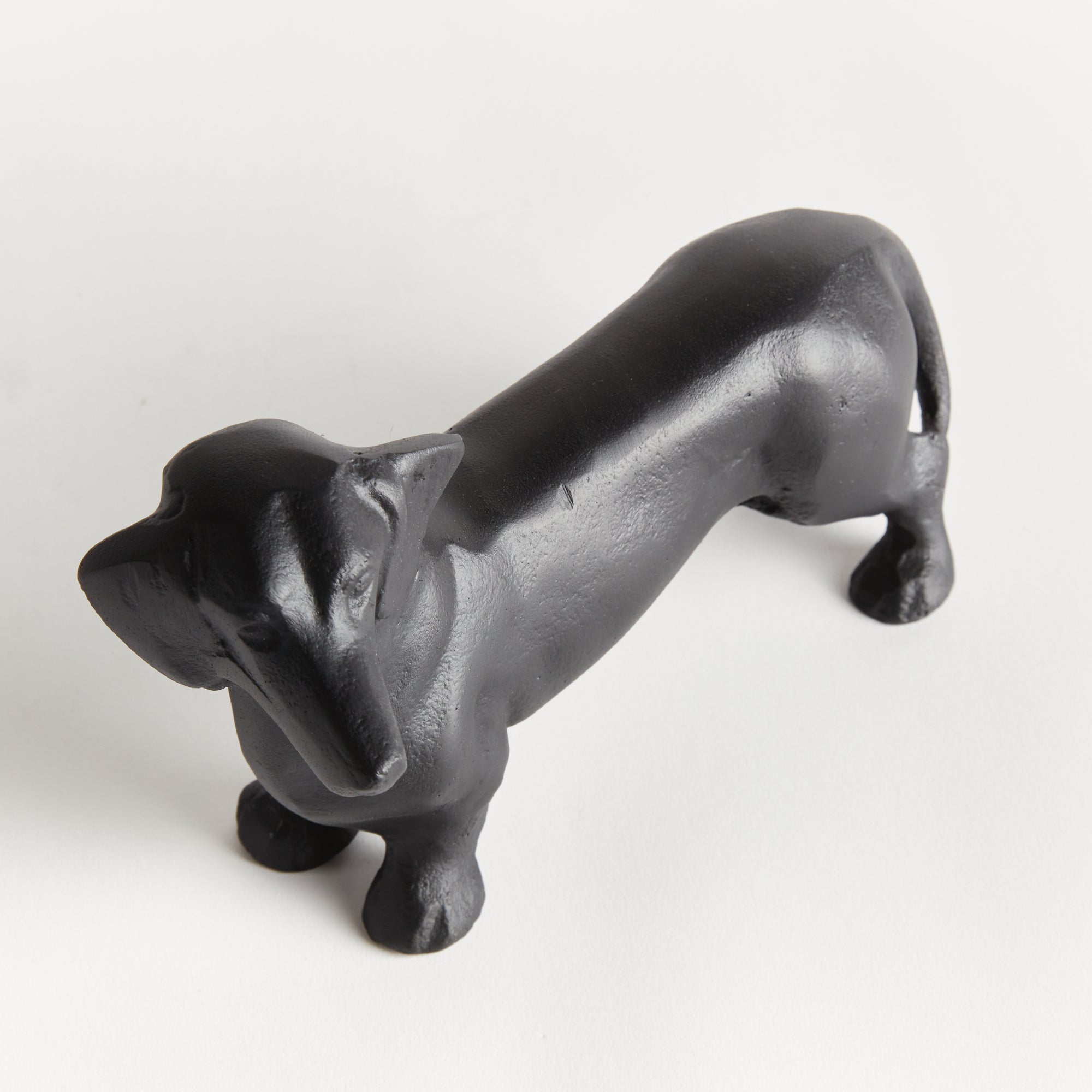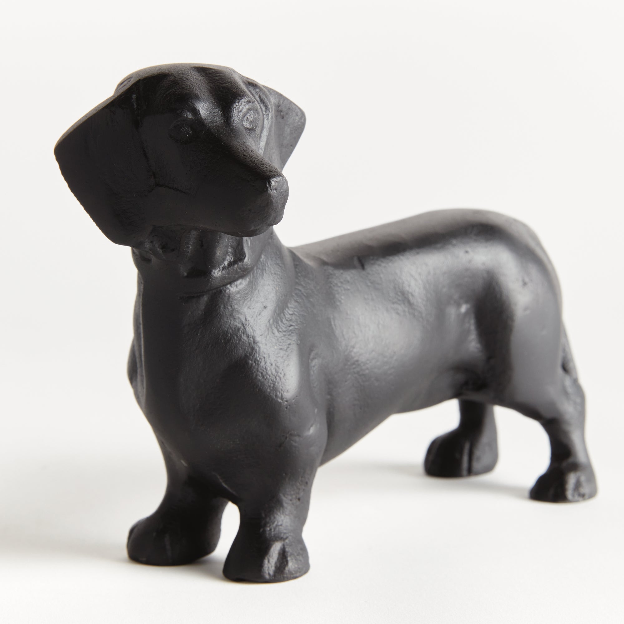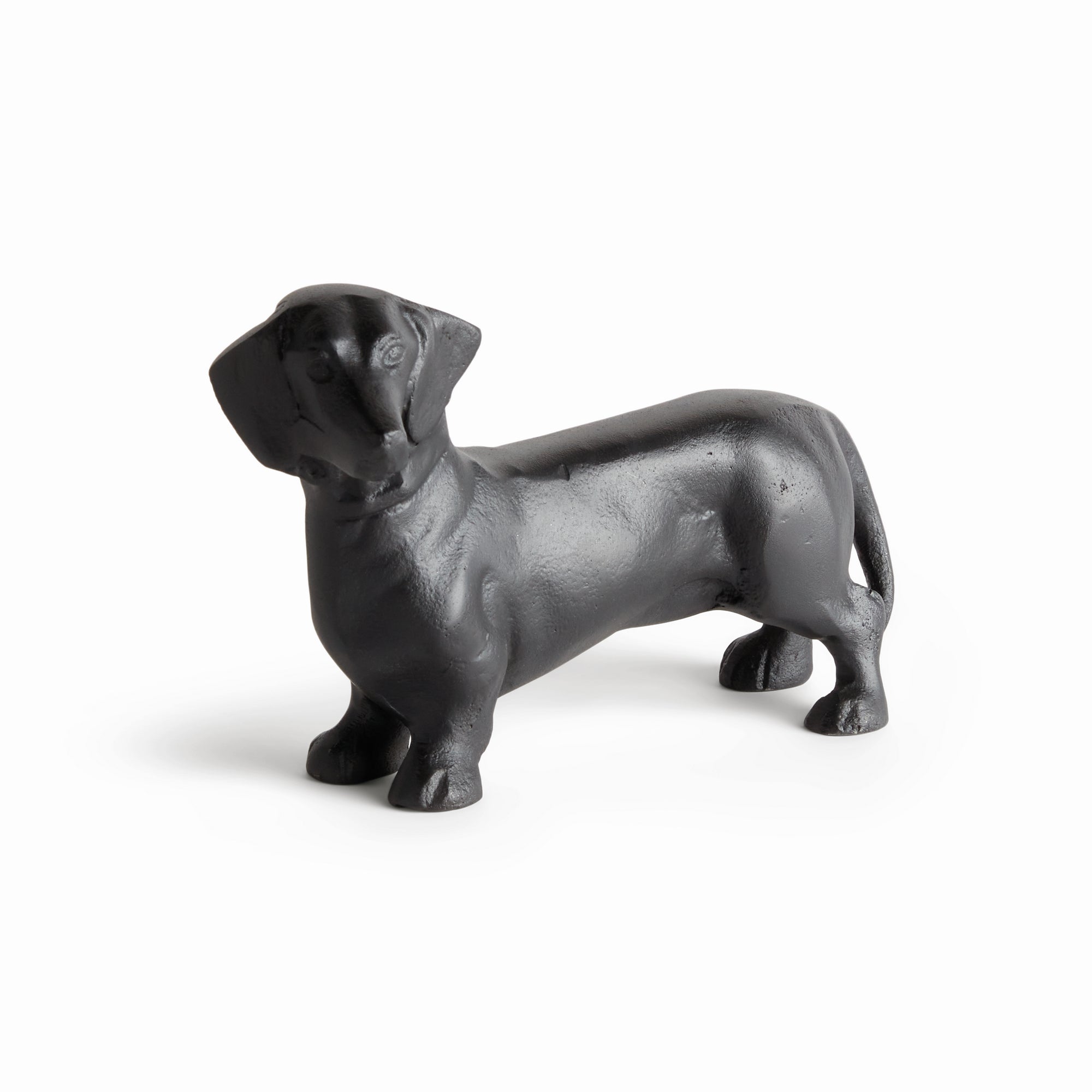 Made of a heavy cast aluminum using a centuries old sand cast method, this regal dachshund sculpture is worthy of a prime bookshelf spot. With realistic signature features, a darling addition to side table or ottoman, as well.