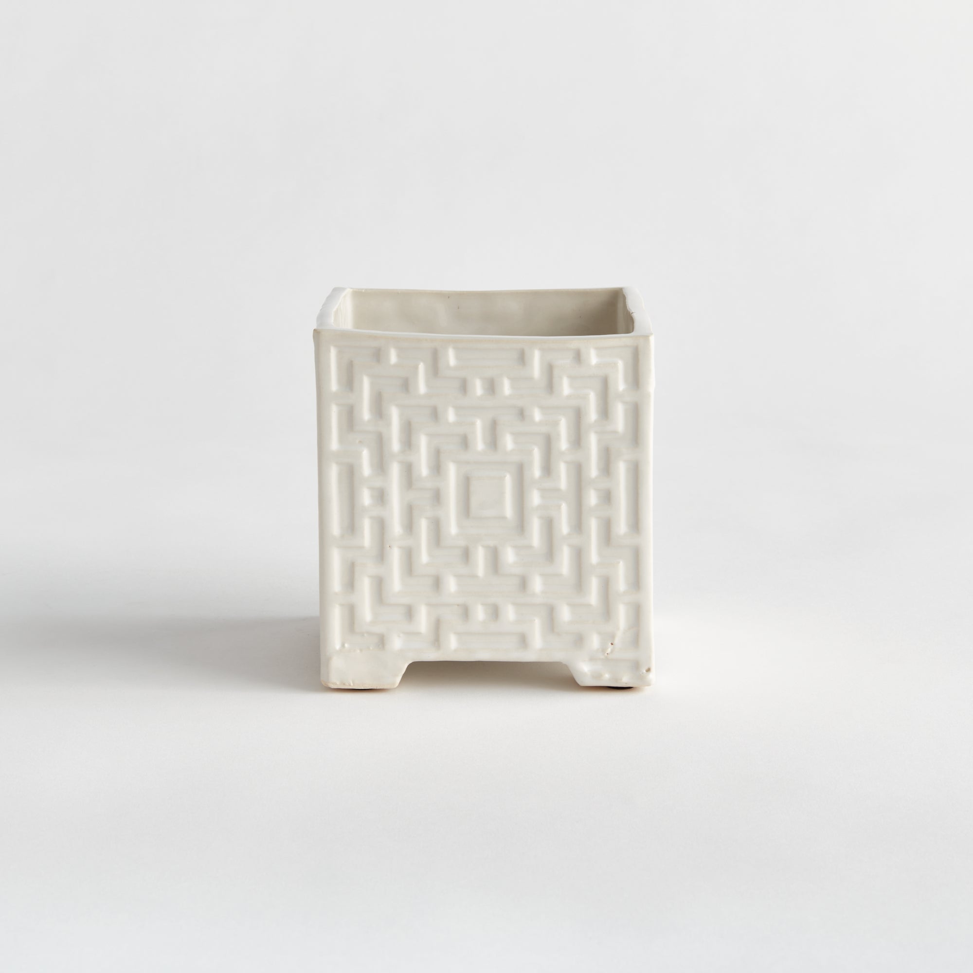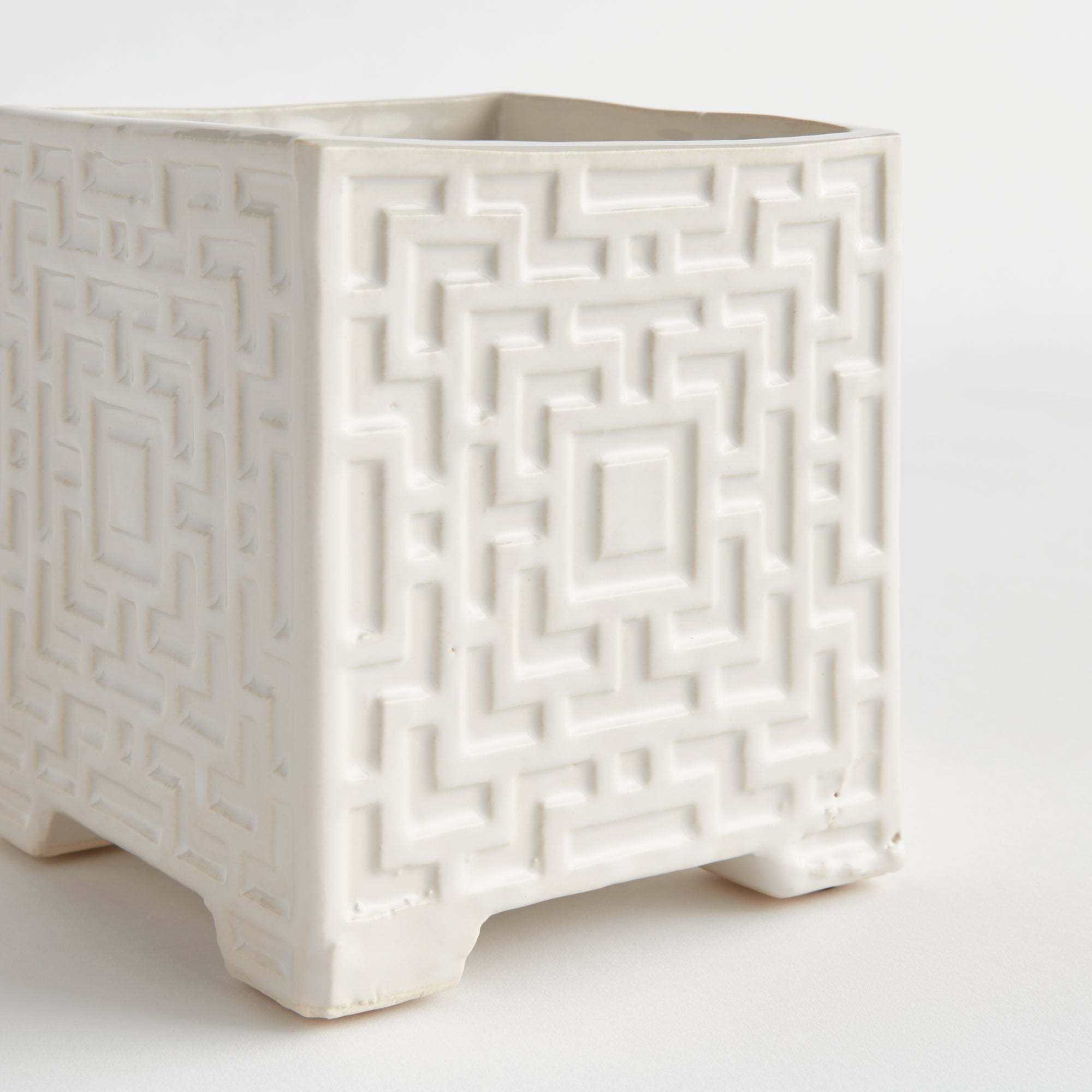 This clean, white cachepot is made in traditional style. With unmistakable chinoiserie-inspired lattice details, it is sure to be an instant classic.