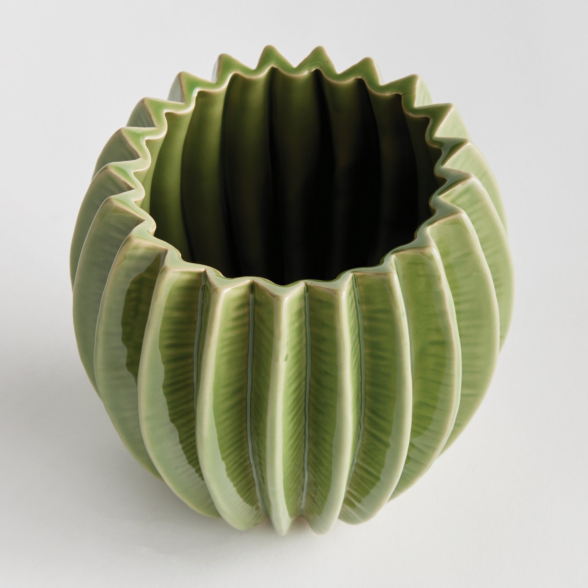With a rounded form, deep ribbing and thickly applied glaze, this nature-inspired pot is a work of art. The hand-finished details give it an artisan's touch. Add a lush green plant or delicate orchid and enjoy. Simply gorgeous.