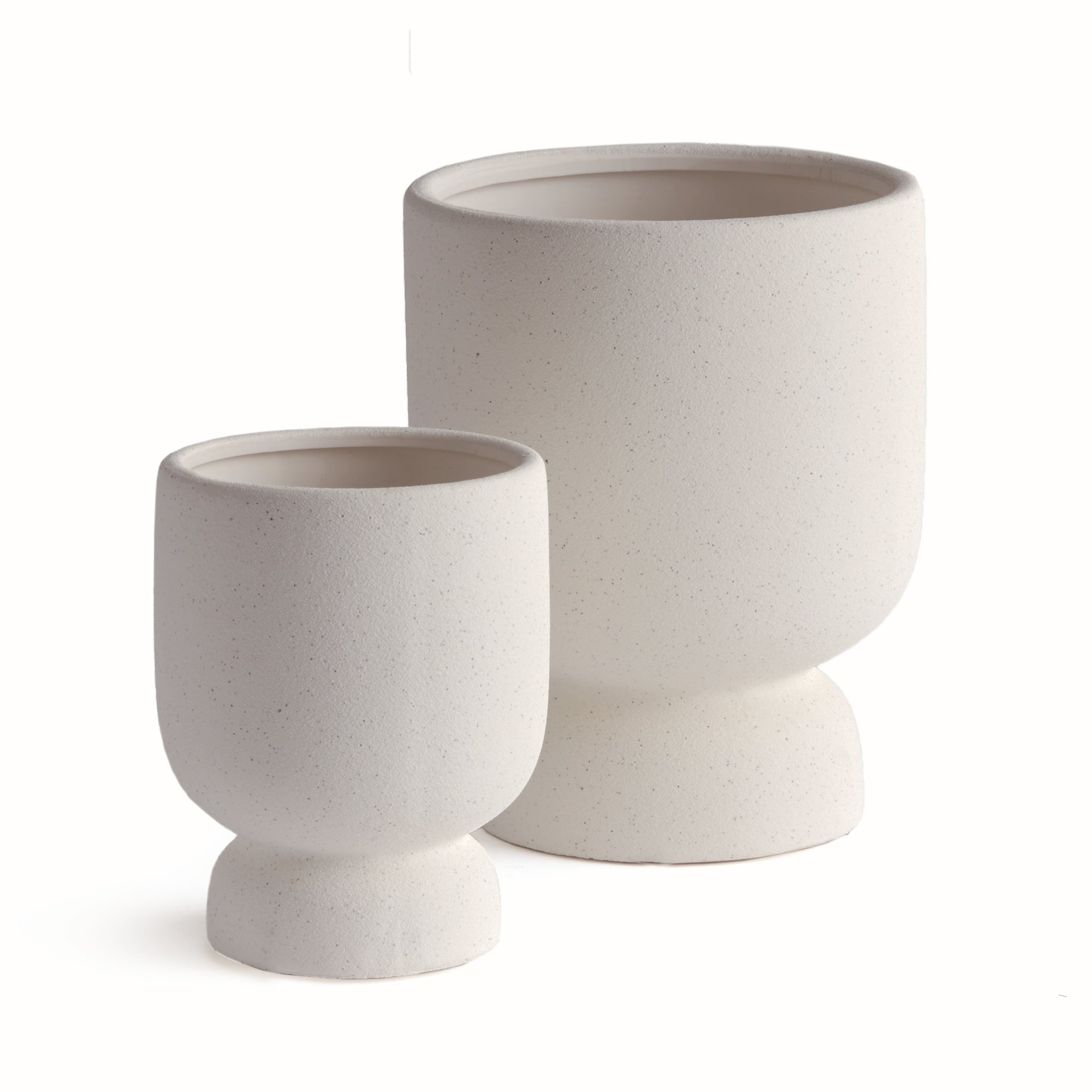Cold finish creates a texture that evokes a sense of coolness or austerity, a muted or subdued color, with minimal gloss creating a matte appearance that is smooth to the touch. These pots embody this finish. A modern, sophisticated look for your plants or florals.