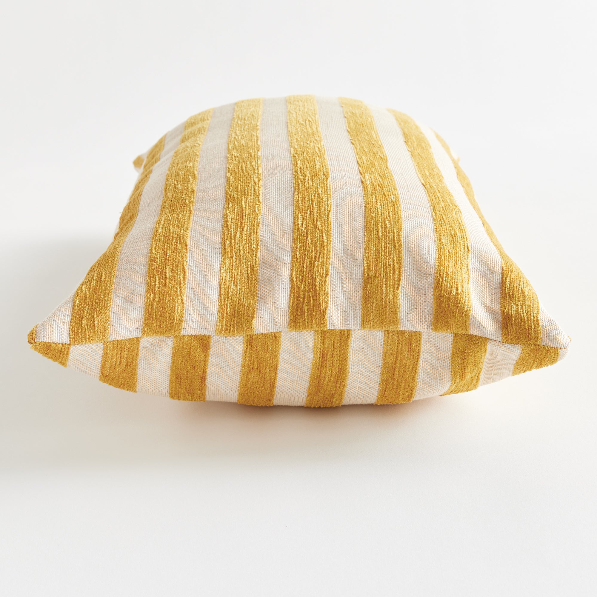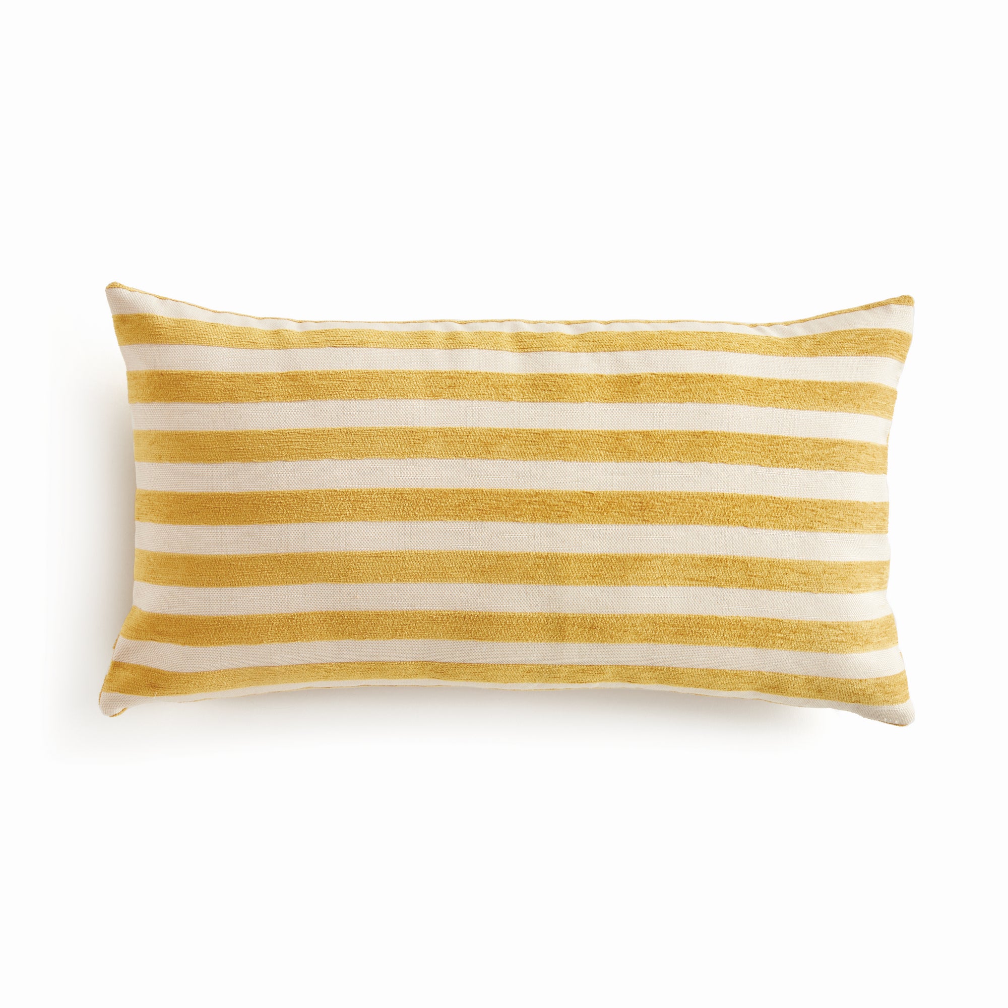 The indoor pillow that lives beautifully outdoors. Enjoy the upscale luxury and durability of Jacquard. With a graphic goldenrod and cream striped pattern, it adds a pop of cheerful color to the sofa. This pillow is weather resistant and responsibly made. Filled with 100% recycled fibers.