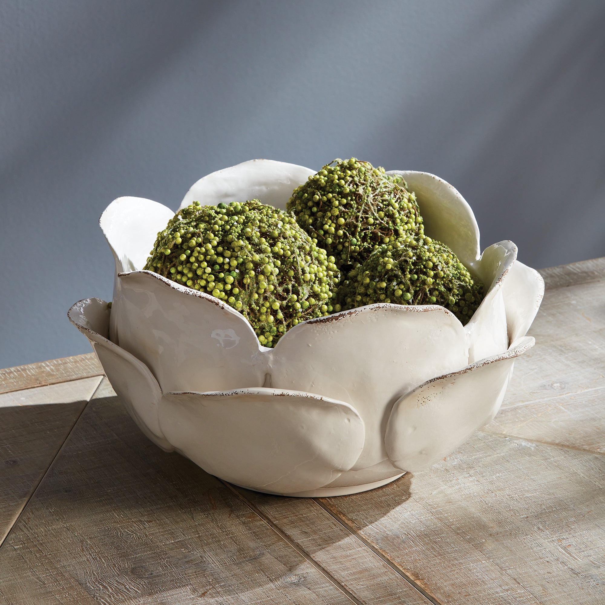 Each and every petal of the Di Rosa Decorative Bowl is handmade, and hand-applied by Italian artisans in Tuscany, Italy. A seamless design in a soft white glaze and delicate antiquing along petal edges. With a classic Italian craftsmanship passed down through generations, each piece is a true original. In grand scale, a dynamic centerpiece for feature table, kitchen island or mantel.