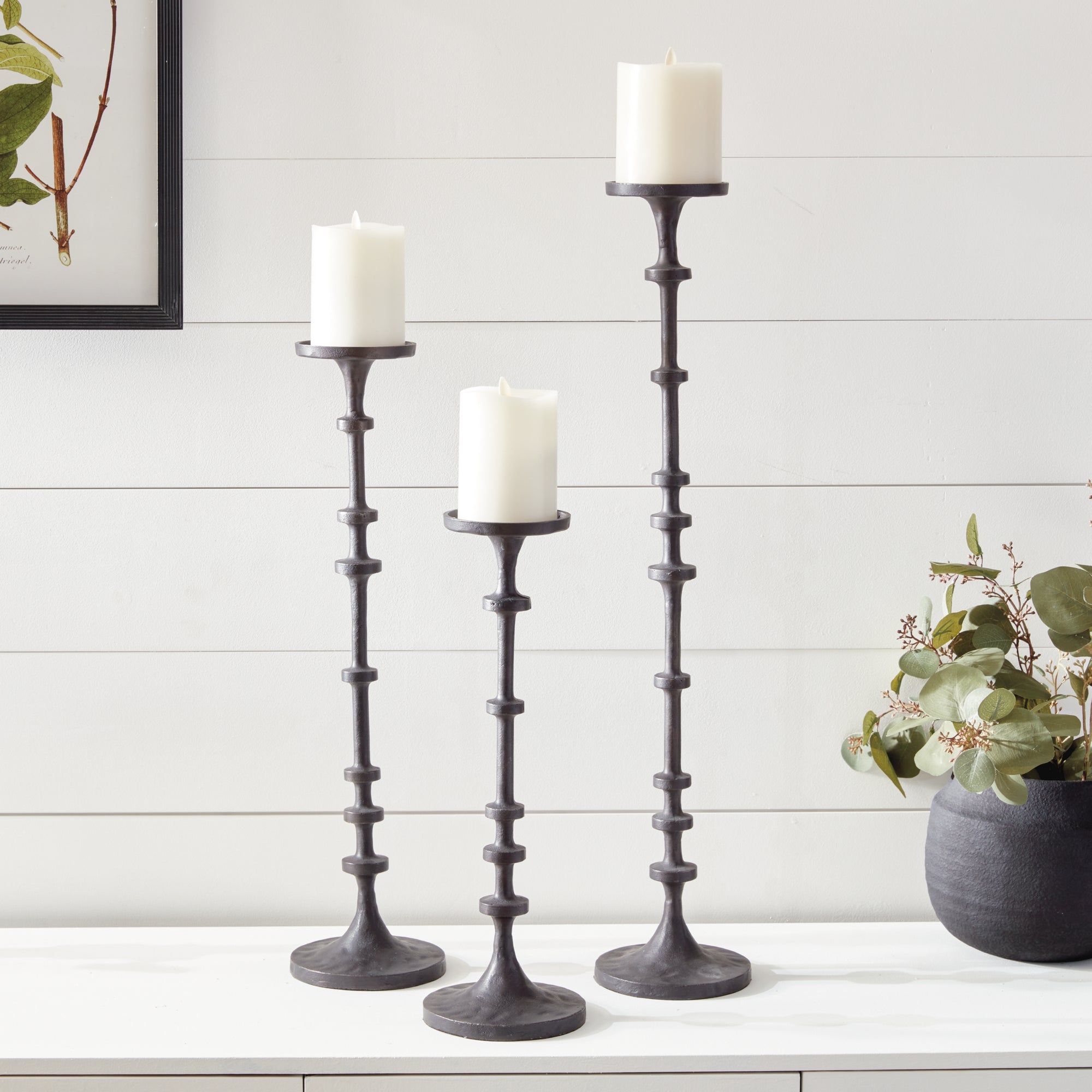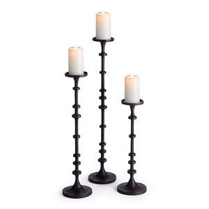 These substantial, over-scaled candleholders are great for mantle or front entry. A nod to the old way of counting, the notches along the base add a modern touch.