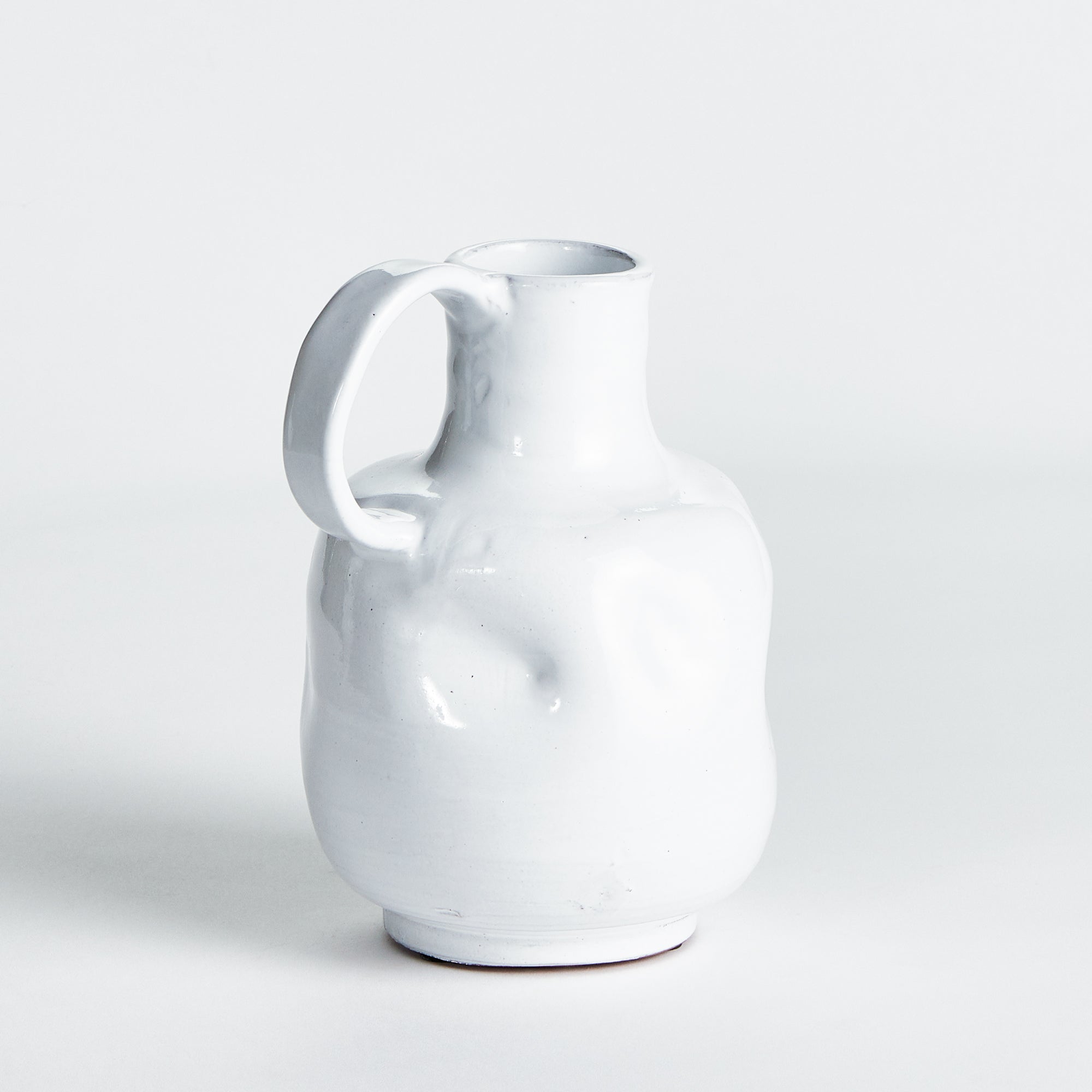 Made with an intentionally irregular shape and delicate handles, this vase is a one of a kind look. Finished in a crisp white shiny glaze, it fits in just about any well-designed space.