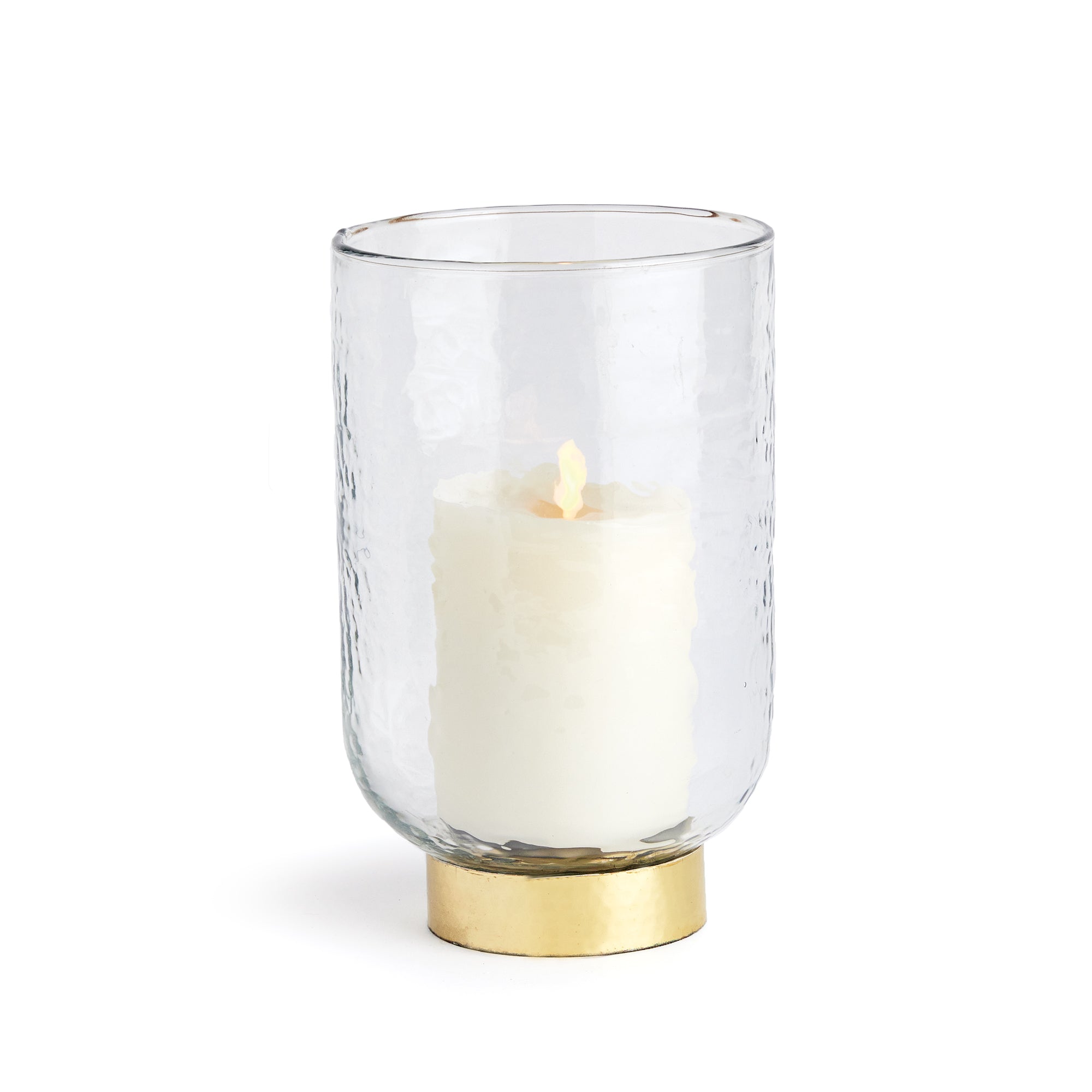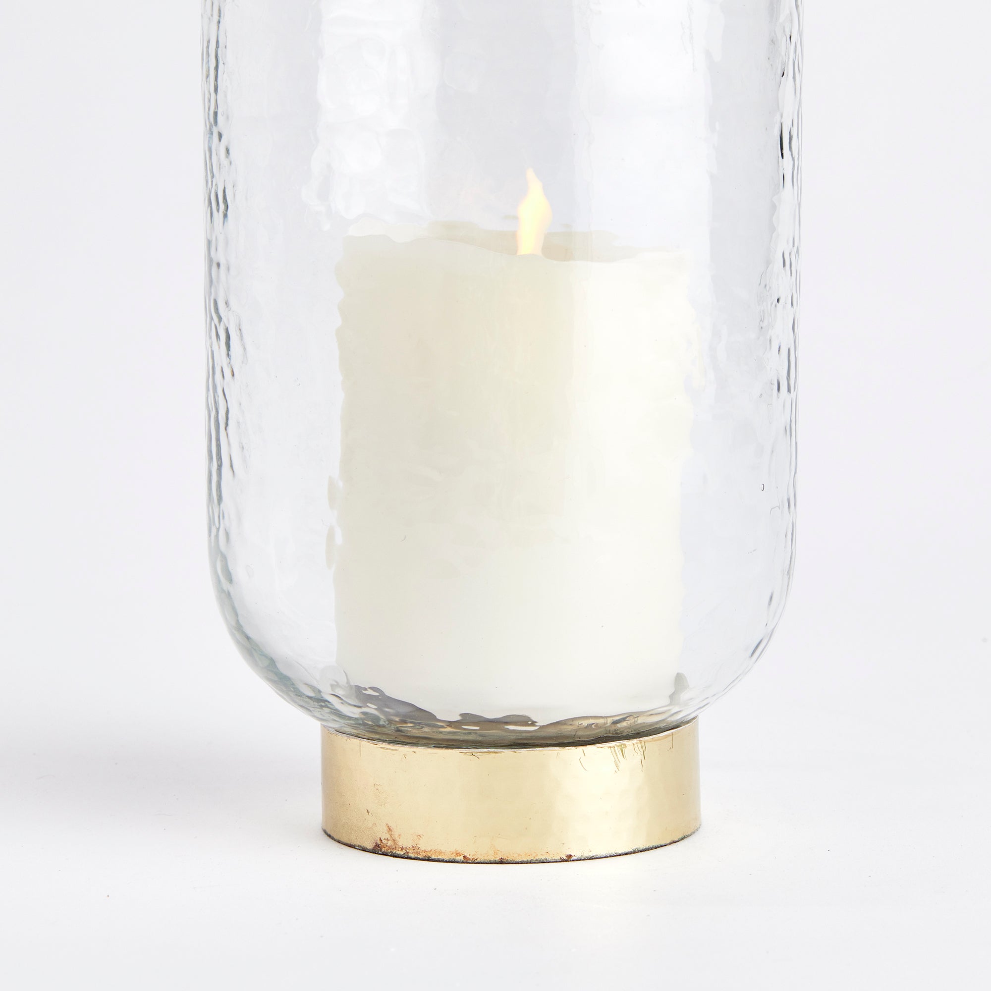 Made of a thick, hammered glass and featuring a melted uneven edge this hurricane has an artisan's touch. Finished off with a hammered gold rim base, an elegant accent for console, bookshelf or mantel.