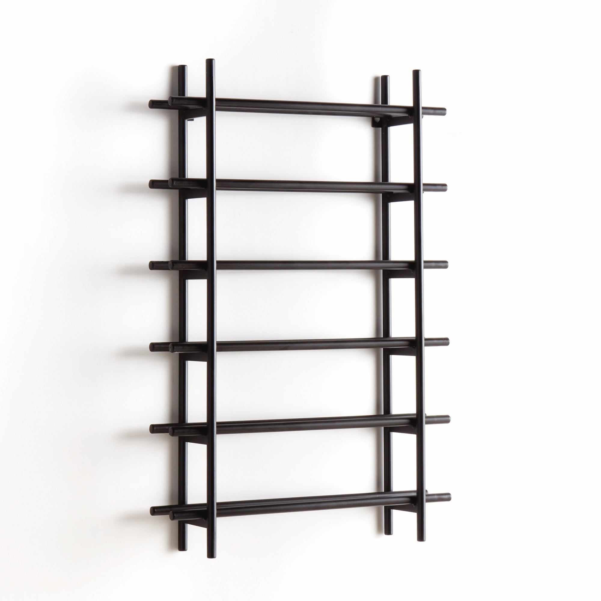 Clean and modern, this handsome wine rack is made of round metal stock. It effortlessly showcases your favorite six bottles. A sturdy, wall-mounted design, it uses a minimal floating shelf design for a lighter look.