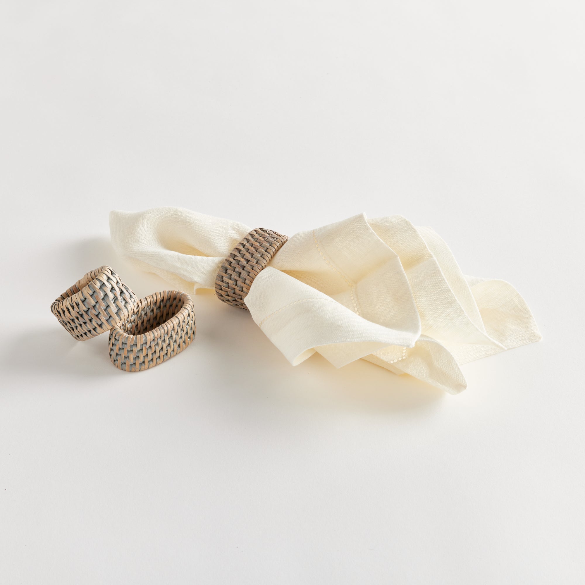 These napkin rings are a classic look. In a warm natural gray, a beautiful way to carry the structured rattan look throughout the home.