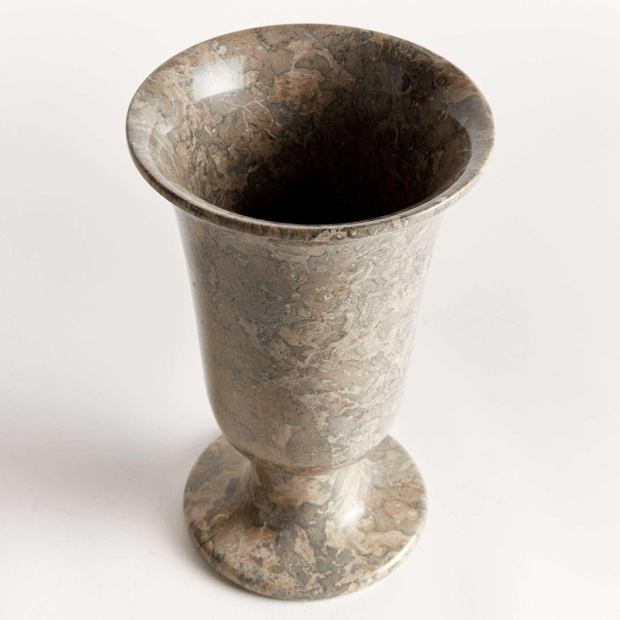 Honed to a semi-matte finish, this stunning marble is particularly known for its unique dark brown to light brown broad lines. The clay minerals found in this type of marble are what gives our footed vase its stunning unique brown veining. A beautiful accent atop home office desk, bookshelf or entry console.