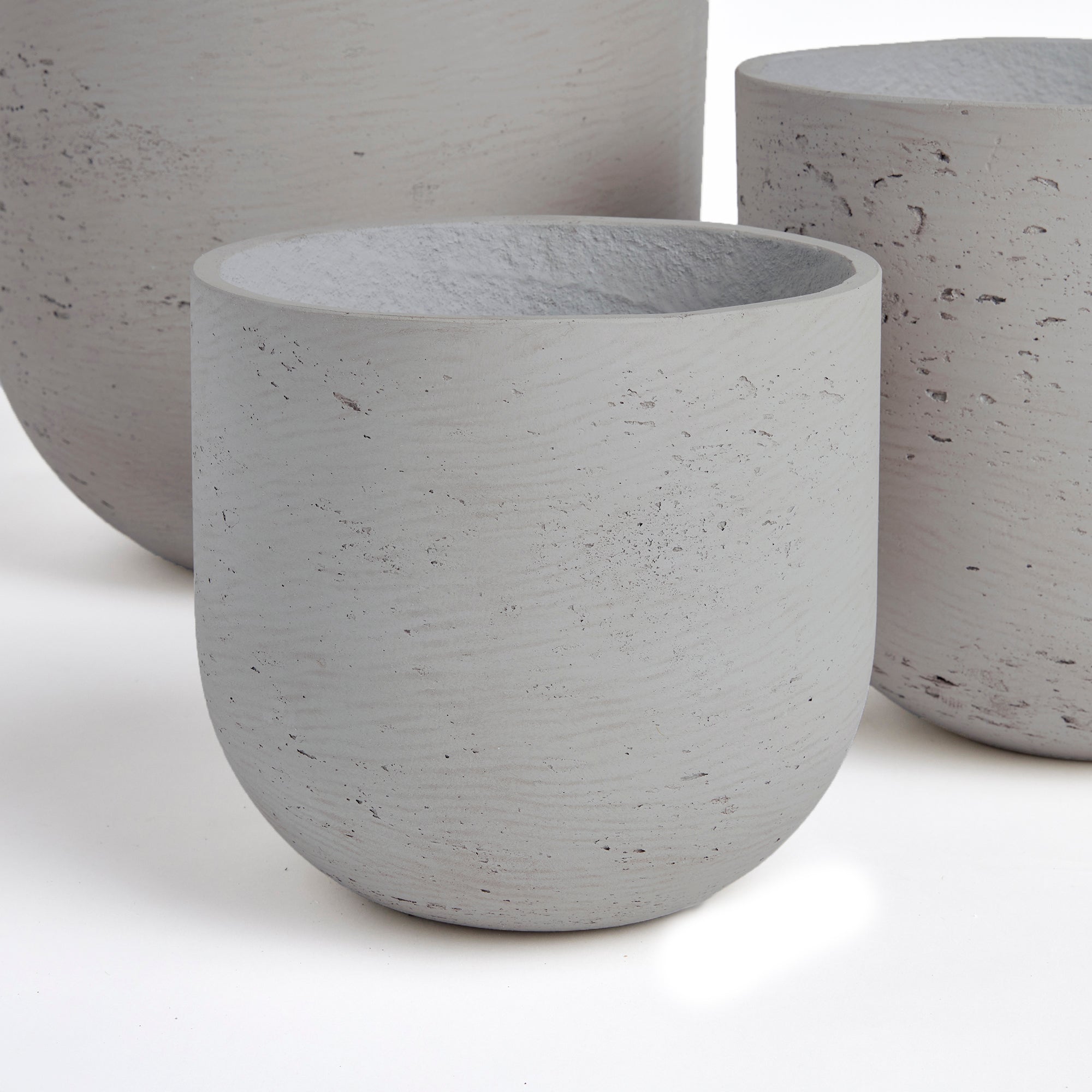 Made of Concretelite, a composite of concrete and other materials, making them lighter than they look. A signature dynamic texture and gray wash, these large scale pots are made for the modern industrial space. Inside or out.