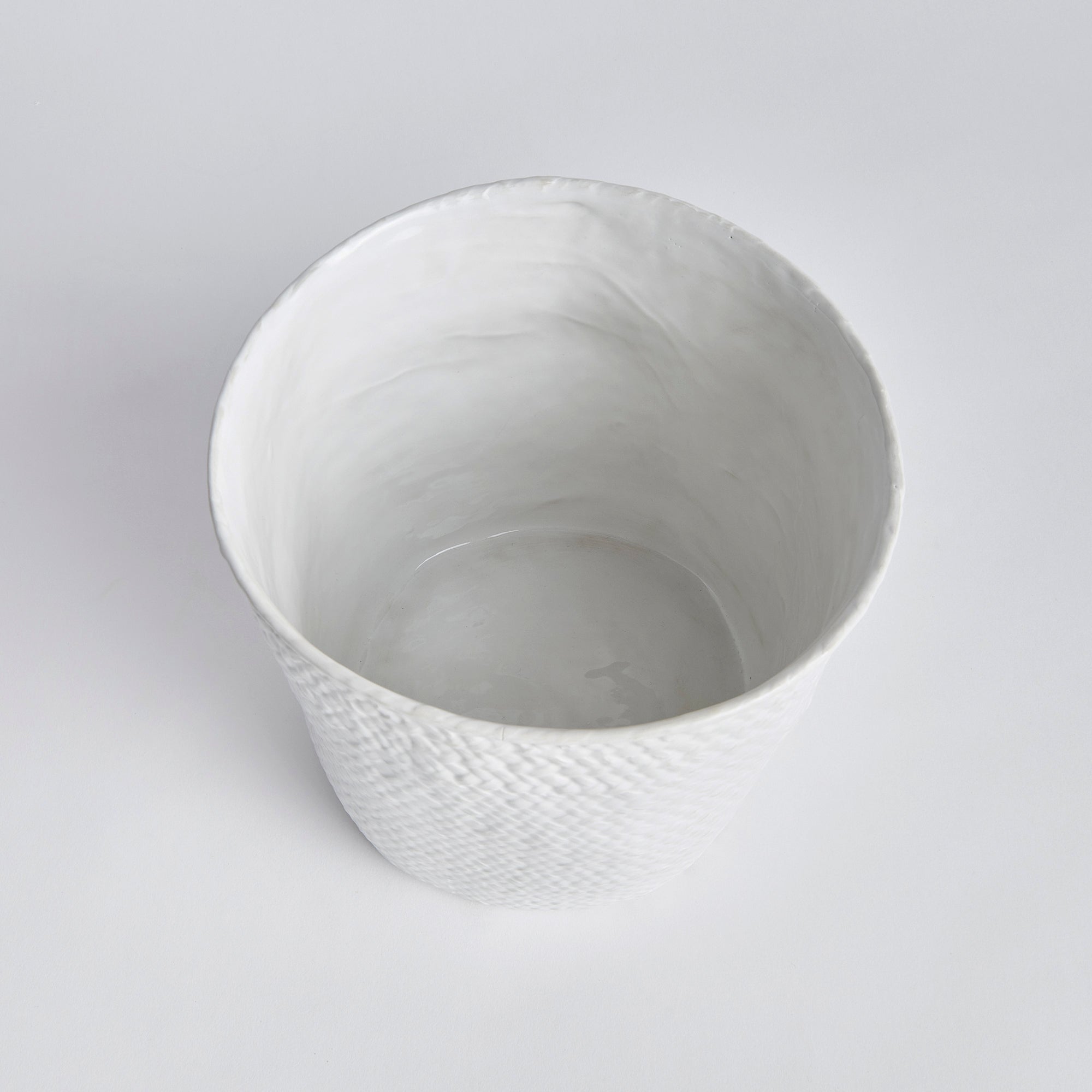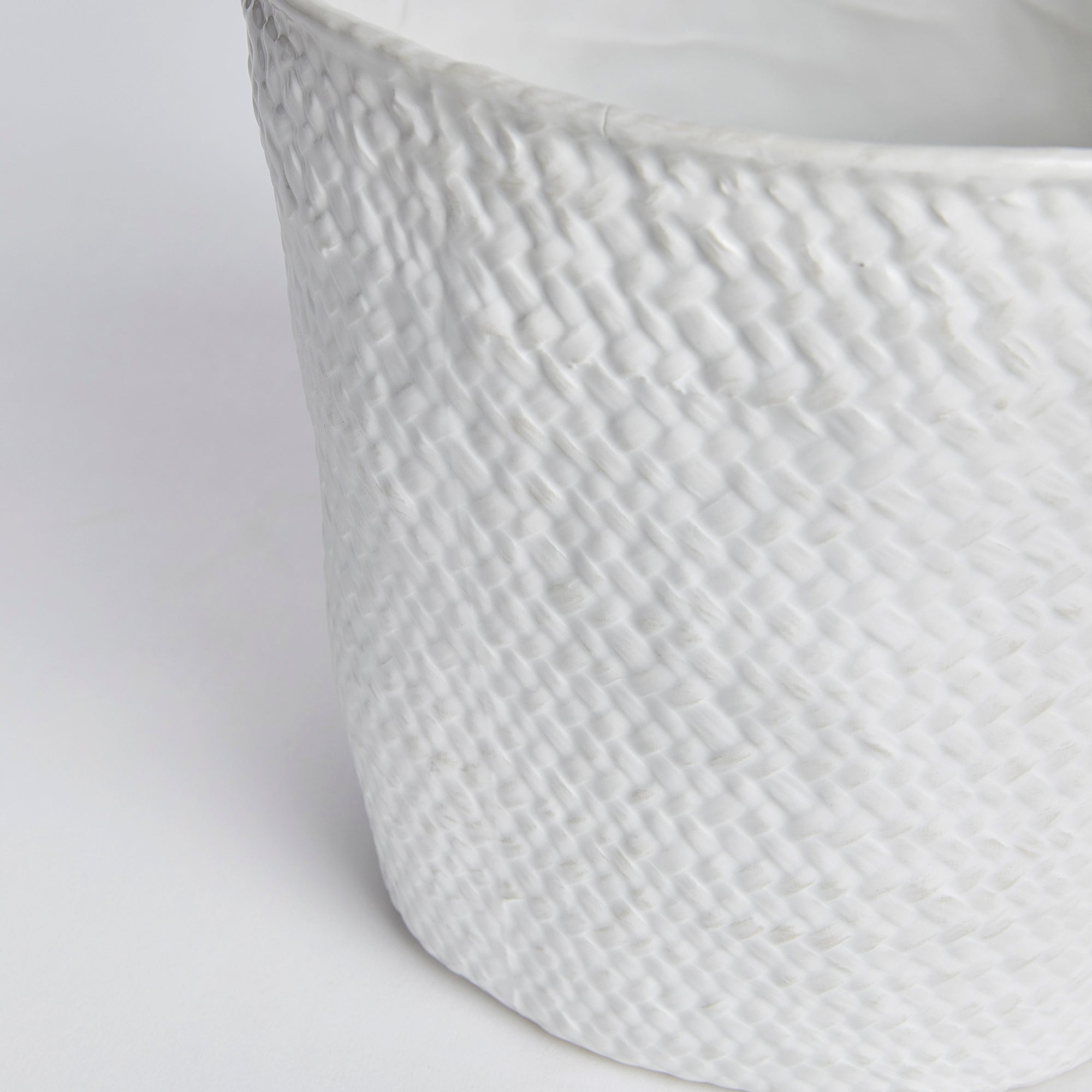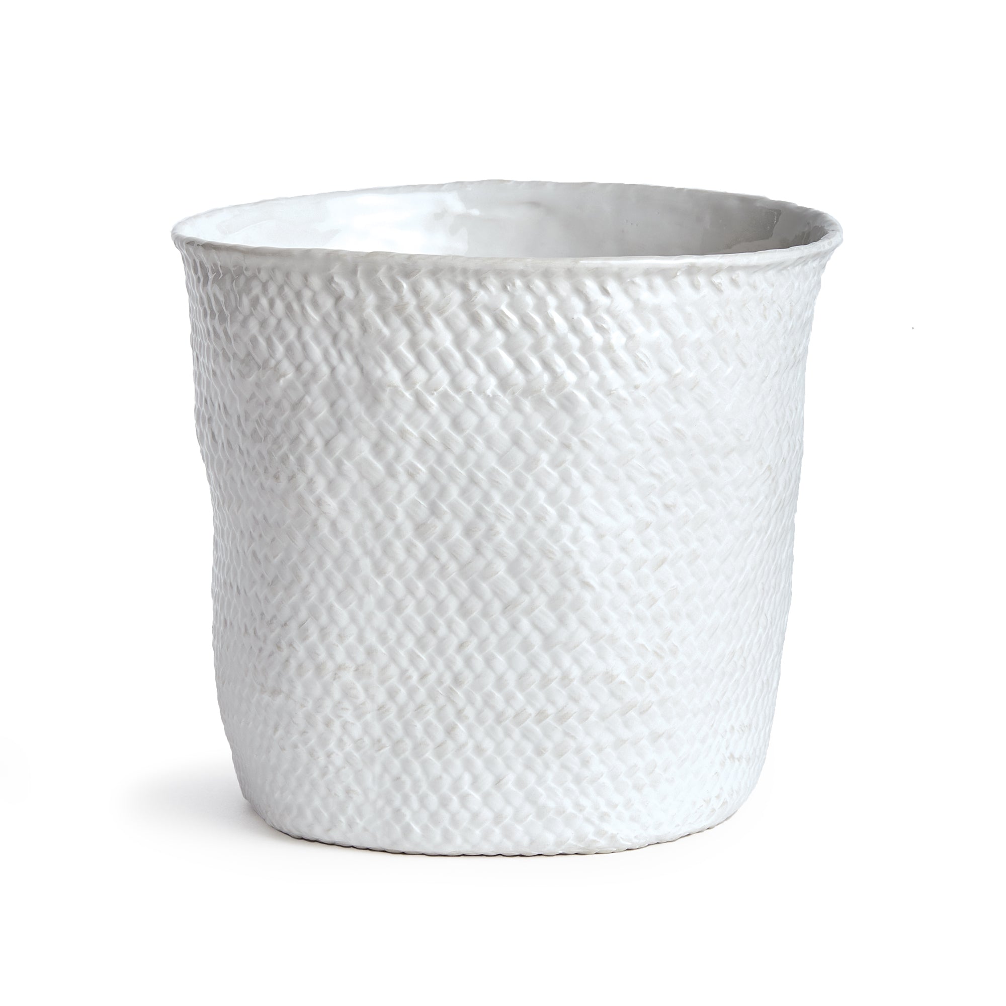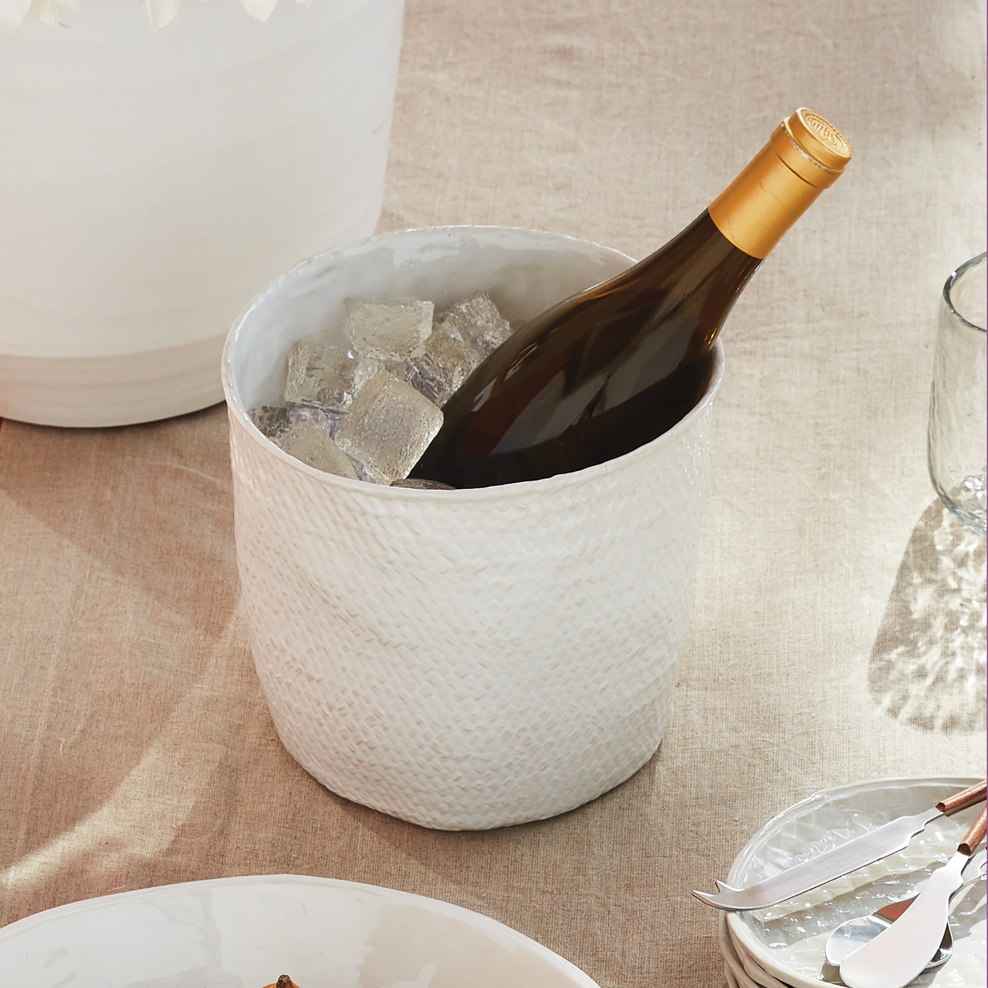 Cast from a real woven basket and finished in a thickly applied translucent glaze that falls away from embossed areas. A nice light, neutral addition to the modern tablescape. Fill it with your favorite vino and chill it in style.