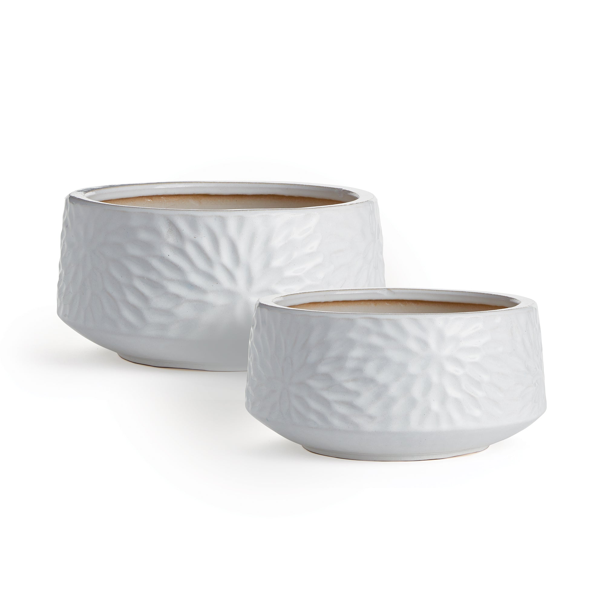 This over scaled set of Emmy Pots are full of cheerful personality. With a petal-like pattern, a low profile and a soft ivory glaze they are sure to brighten any space.