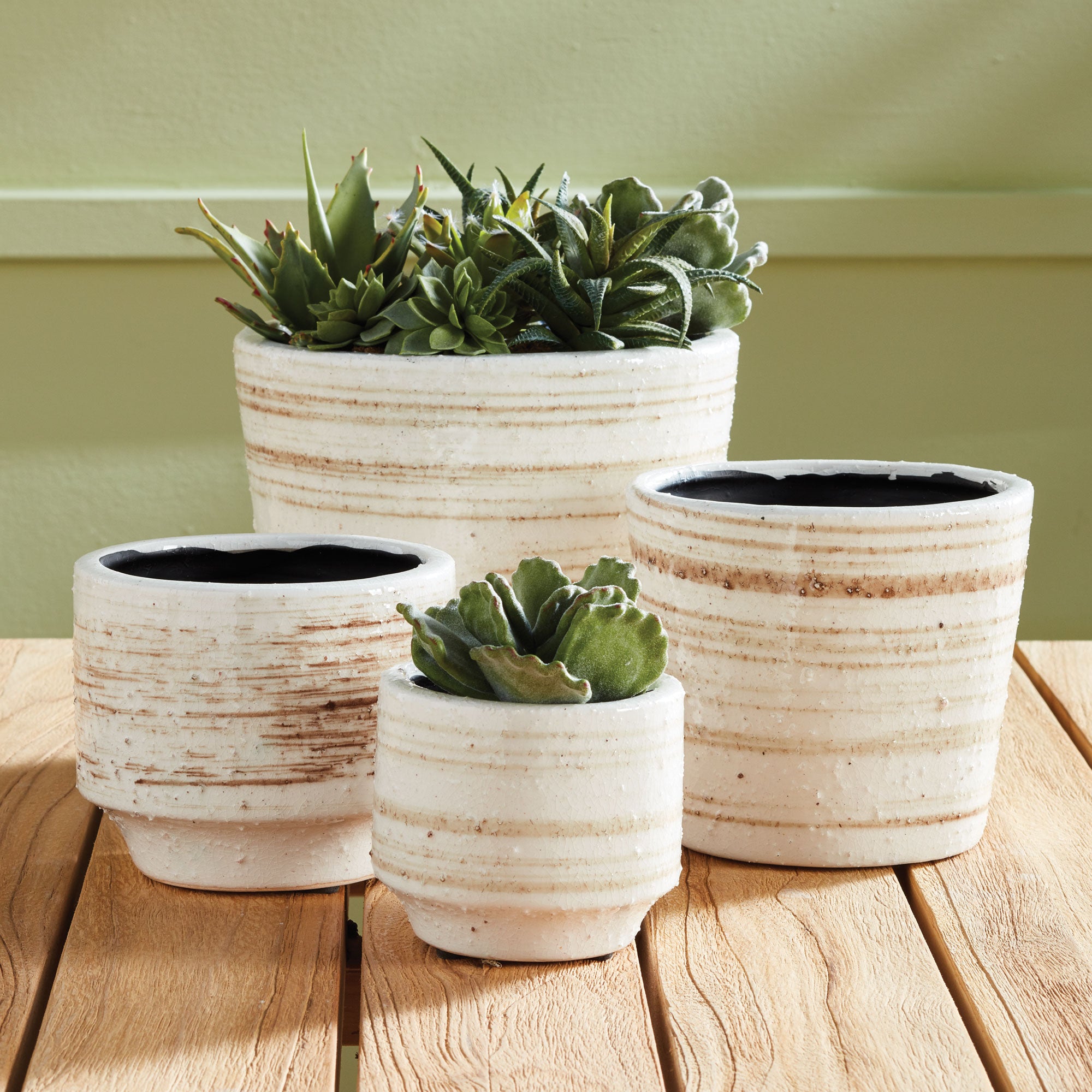 A signature striped glaze and stipled texture sets the Finch Pots apart. A soothing neurtal tone makes them a great fit for the modern-industrial space.