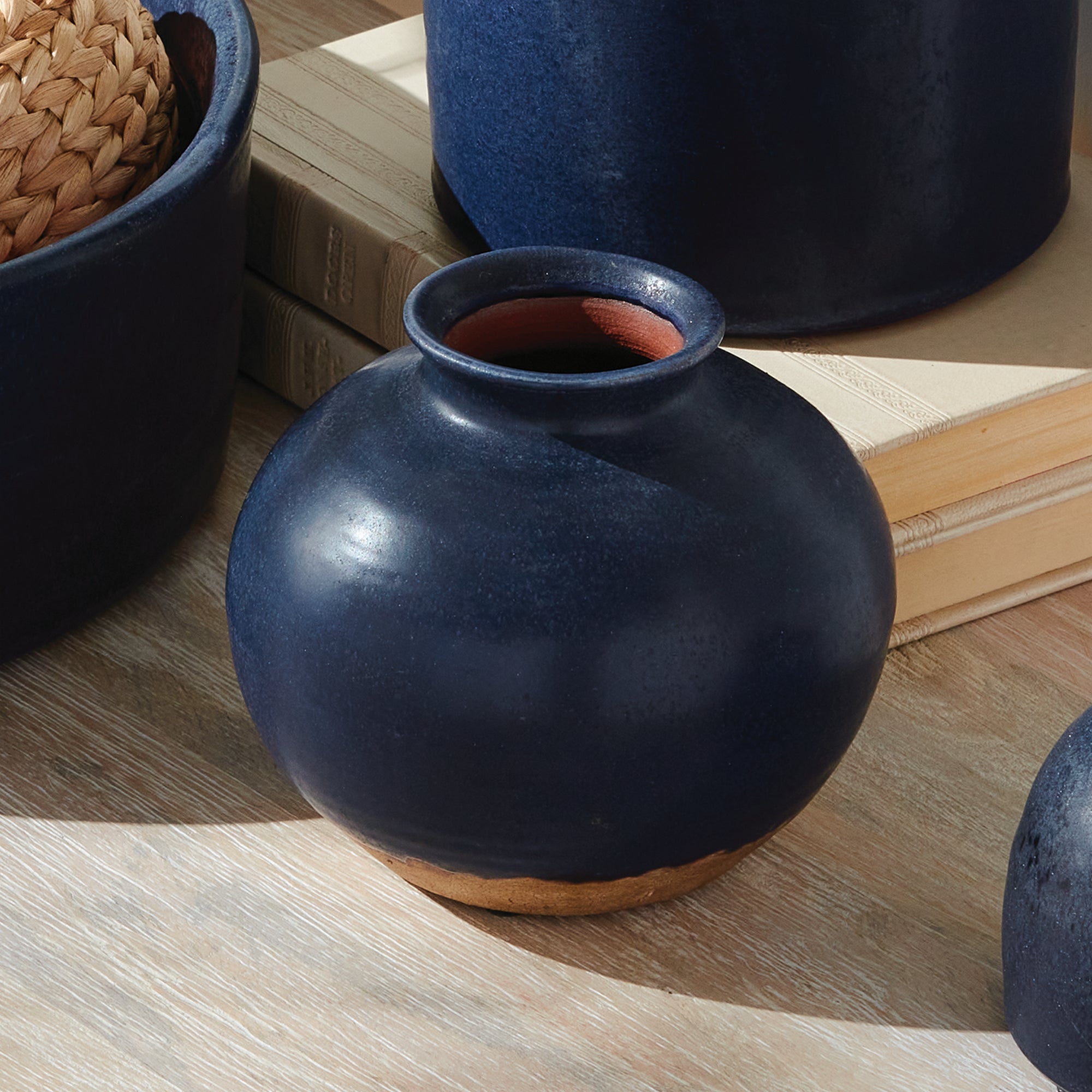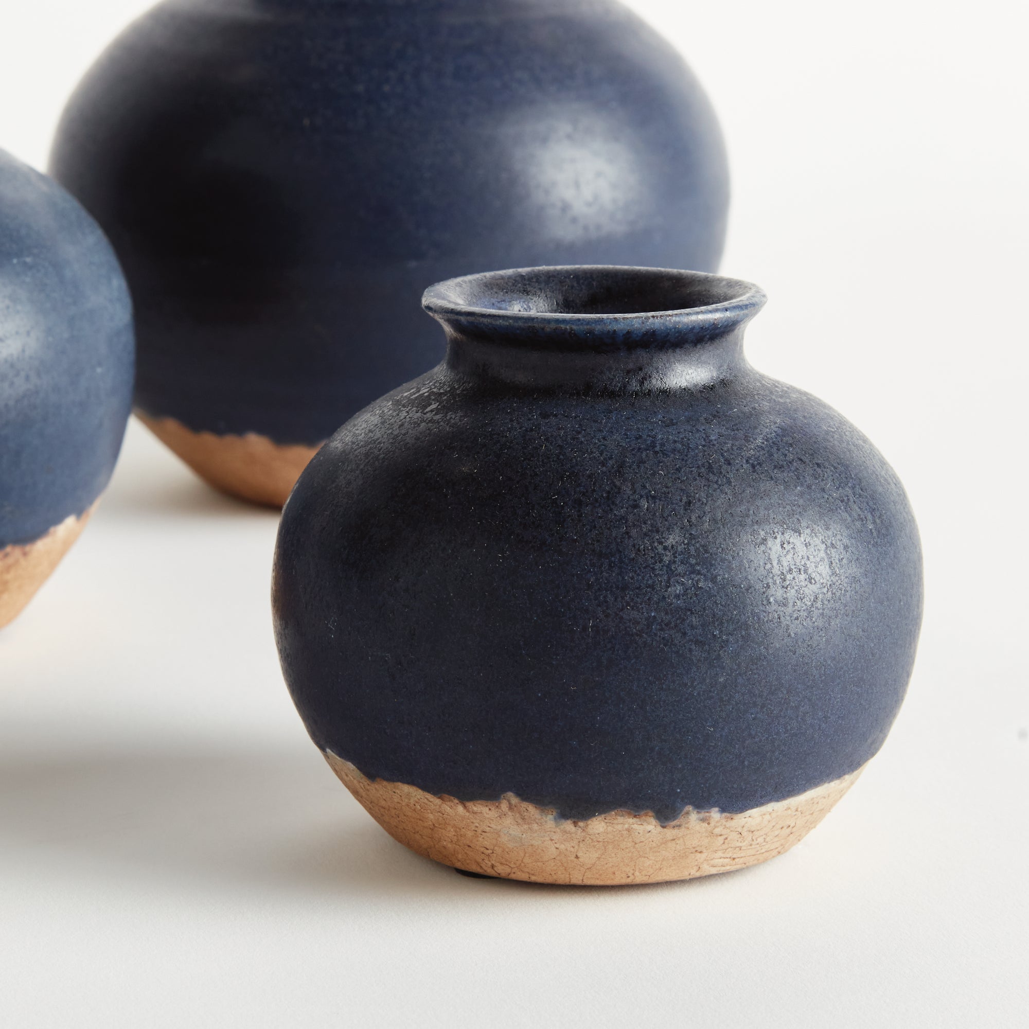 With a crackled glaze, raw unfinished base and uneven texture, this set of terracotta bud vases is simple and raw. In an on-trend matte deep navy, like a freshly made, hand-pressed ceramic set direct from the artist. With a few faux stems or just as is, an understated accent for the well-styled coffee table, kitchen island or countertop.