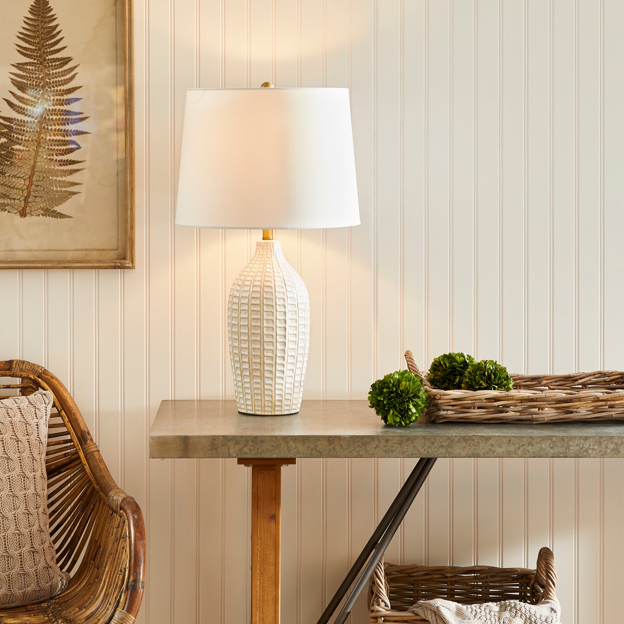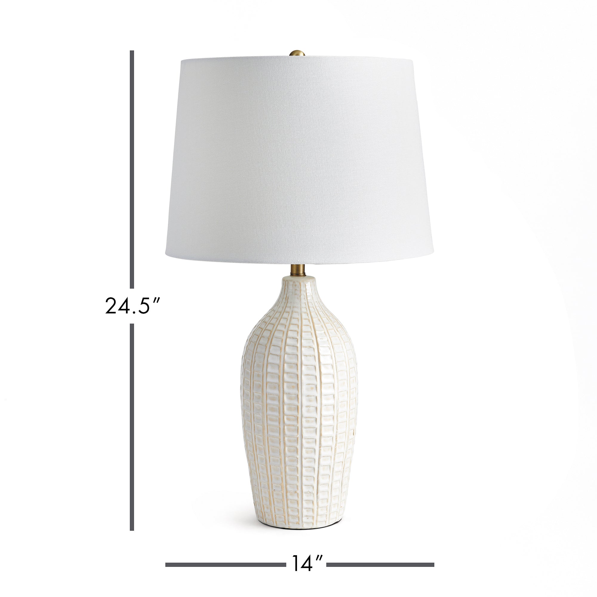 With a pressed pattern on the ceramic body, the Nadia Lamp is a work of art. Topped off with a generously scaled fabric shade, it is sure to enhance any space.