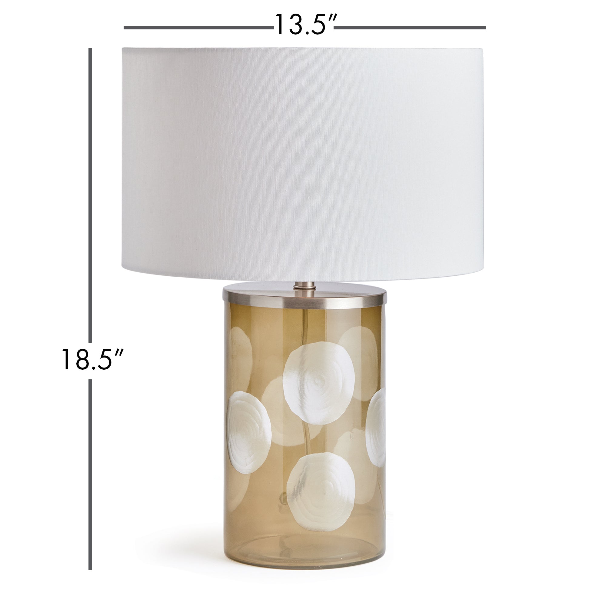 Looking for some whimsy in your lighting? This lamp is a soft taupe glass with oversized etched polka dots. Finished off with a bright white linen shade, a truly whimsical accent for console, desk or side table.