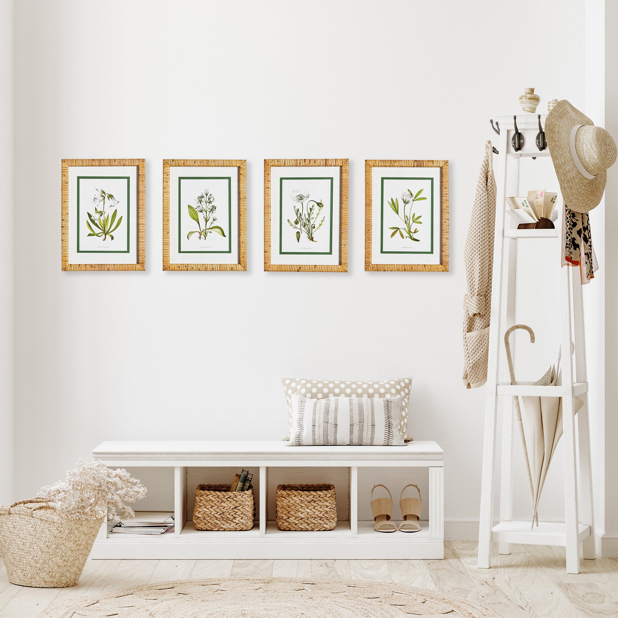 Four different types of florals all in white are rendered here in classical style. Finished with real mats and a bamboo-wrapped pine wood frame, a fitting set for study, powder room or bedroom.